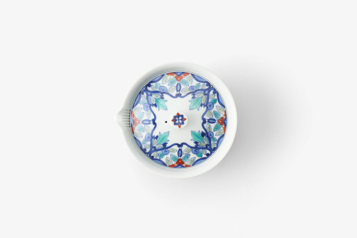 格調高く気品に満ちた鍋島更紗紋様を李荘窯の解釈で表現しています。